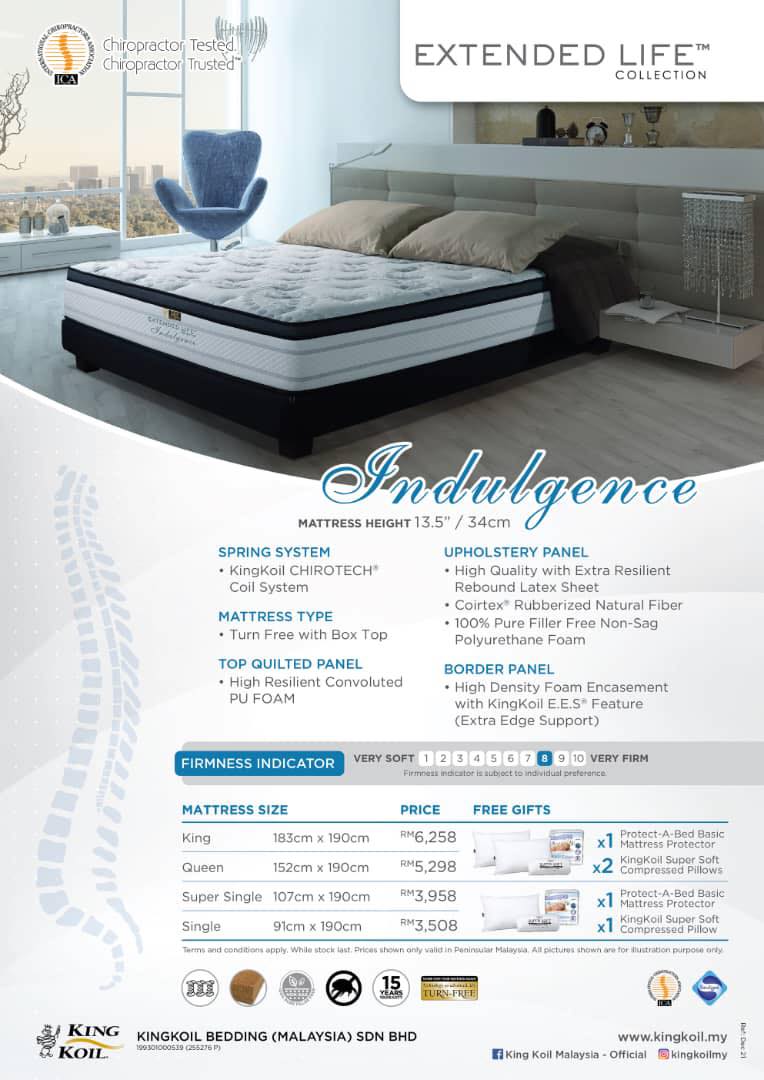 SPRING SYSTEM: Kingkoil CHIROTECH® Coil System MATTRESS TYPE: Turn Free with Pillow Box Top TOP QUILTED PANEL: High Resilient Convoluted PU FOAM UPHOLSTERY PANEL: High Quality with Extra Resilient Rebound Latex Sheet Coirtex® Rubberized Natural Fiber BORDER PANEL: High Density Foam Encasement with KingKoil E.E.S® Feature (Extra Edge Support) |