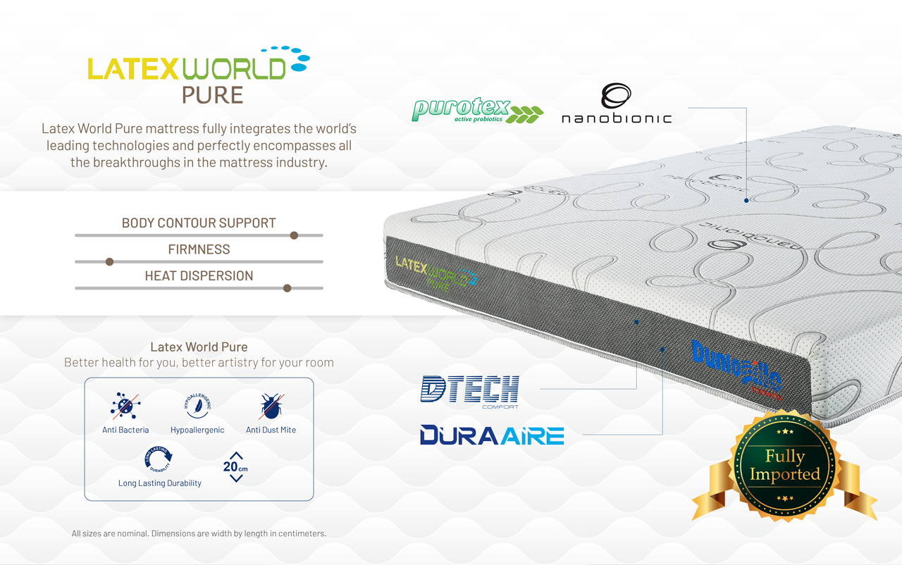 -Dunlopillo Talasilver Wave Latex -100% Pure Natural Latex -Anti Dust Mite & Anti Bacteria -Hypoallergenic -NanoBionic Function which can help body recharge faster than normal mattress -Purotex Technology -Dtech Comfort & Dura Aire Contour Support |