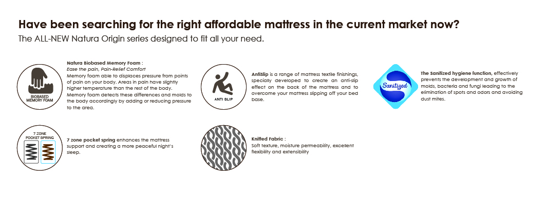 -Natura Biobased Memory Foam -7 zones pocketed Spring -Anti Slip -Knitted Fabric provide soft feature, moisture permeability, excellent flexibility , and extensibility -Sanitized hygiene function which prevent development and growth of molds, bacteria and fungi -Anti Bacterial , Anti Dust Mite and Anti Fungi |