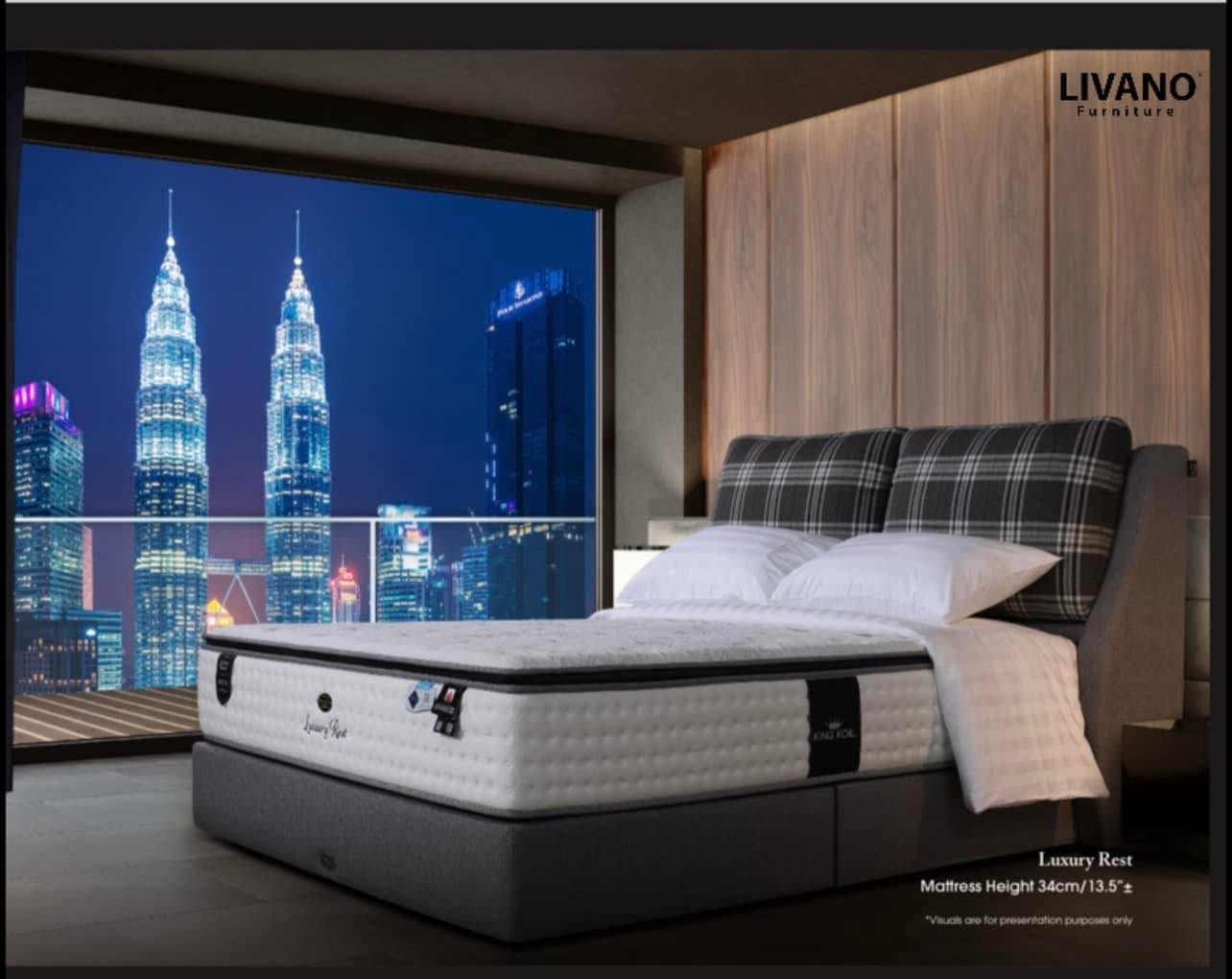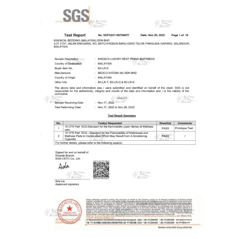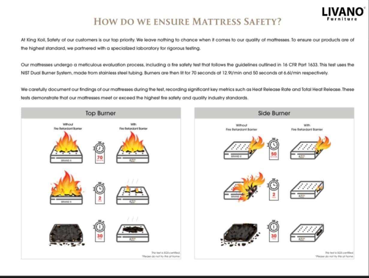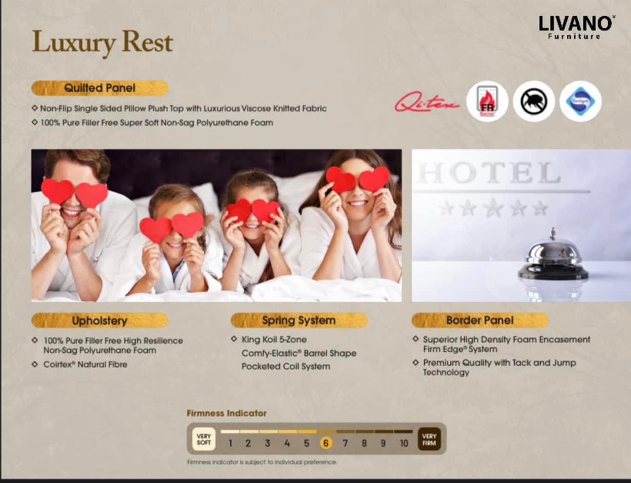 SPRING SYSTEM: King Koil 5-Zone Comfy-Elastic Barrel Shape Pocketed Coil System QUILTED PANEL: 100% Pure Filler Free Super Soft Non-Sag Polyurethane Foam UPHOLSTERY PANEL: 100% Pure Filler Free High Resilience Non-Sag Polyurethane Foam Coirtex® Natural Fibre MATTRESS TYPE: Non-Flip Single Sided Pillow Plush Top with Luxurious Viscose Knitted Fabric BORDER PANEL: Superior High Density Foam Encasement Firm Edge® System Premium Quality with Tack and Jump Technology WARRANTY: 15 Years Warranty against manufacturing defects |
