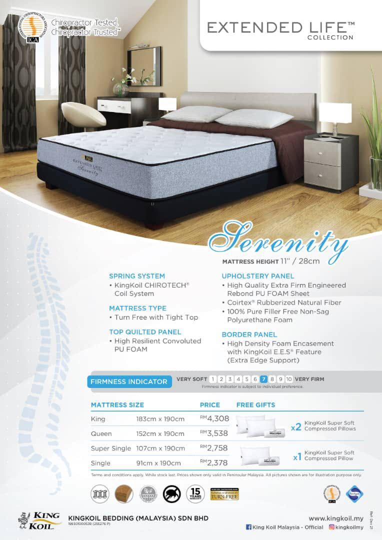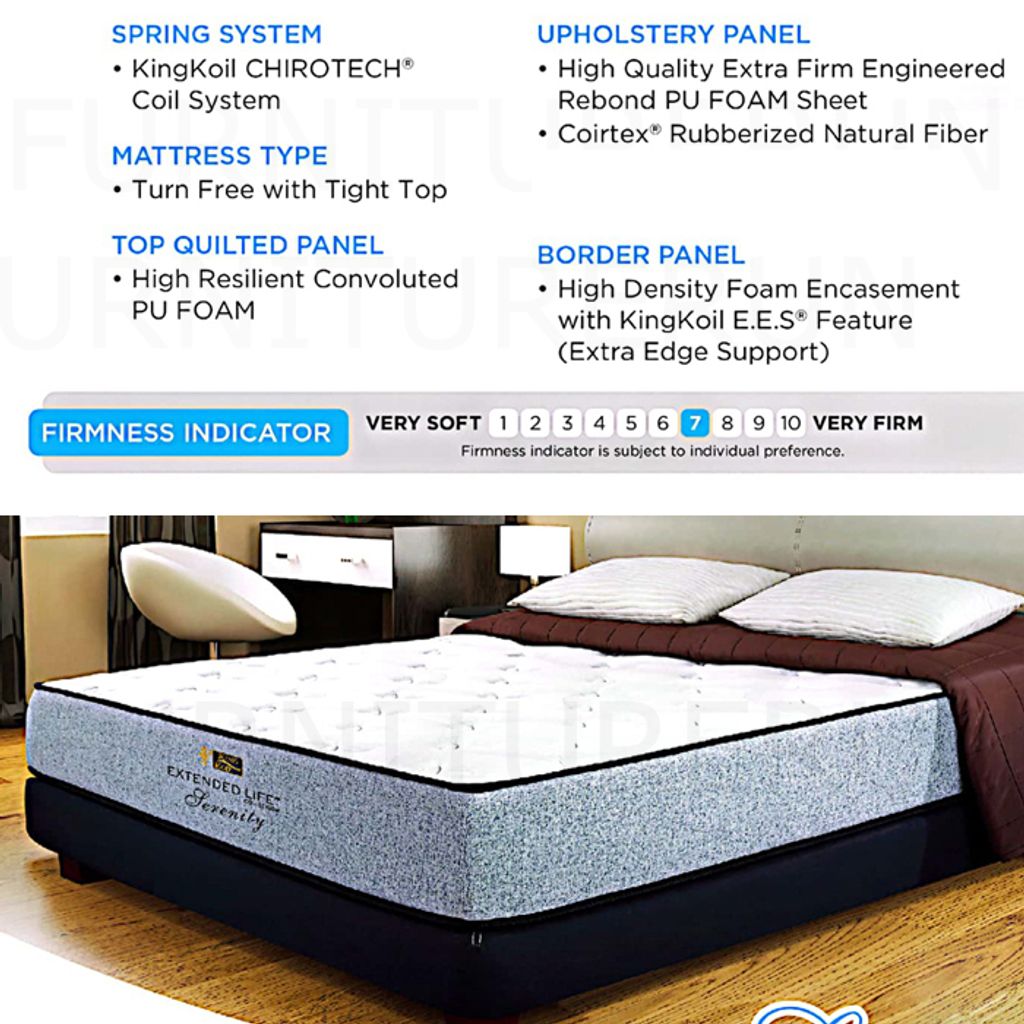 SPRING SYSTEM: Kingkoil CHIROTECH® Coil System MATTRESS TYPE: Turn Free with Tight Top TOP QUILTED PANEL: High Resilient Convoluted PU FOAM UPHOLSTERY PANEL: High Quality Extra Firm Engineered Rebond PU FOAM Sheet Coirtex® Rubberized Natural Fiber BORDER PANEL: High Density Foam Encasement with KingKoil E.E.S® Feature (Extra Edge Support) |