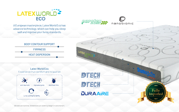 -Dunlopillo Talasilver Wave Latex -100% Pure Natural Latex -Anti Dust Mite & Anti Bacteria -Hypoallergenic -NanoBionic Function which can help body recharge faster than normal mattress -Purotex Technology -Double Dtech Comfort & Dura Aire Contour Support |
